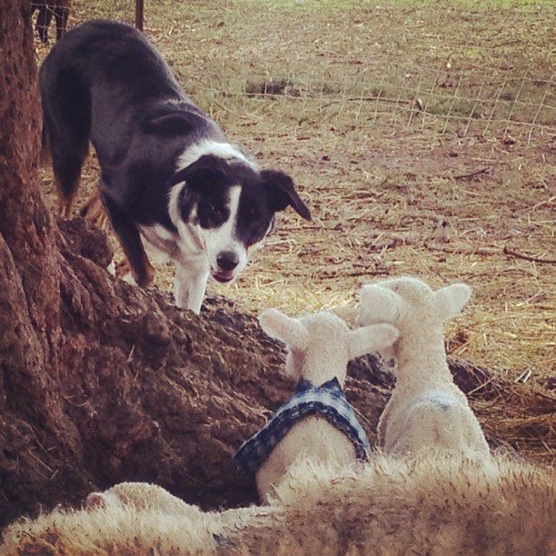 She was so gentle with the lambs. At first she was not quite sure what they were. When Fred walked right up to her and sniffed her nose she quietly tolerated it...then licked him on the face. He hopped away.